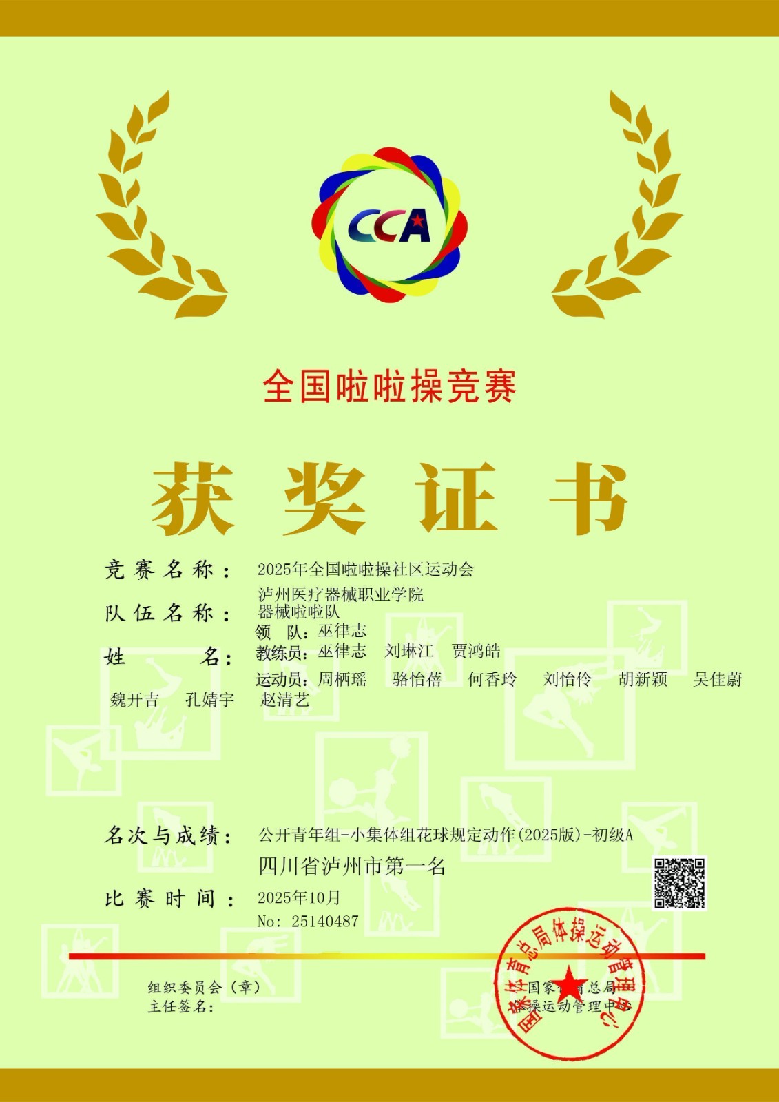 近期,由國家體育總局主辦的全國啦啦操社區(qū)運動會圓滿落幕。瀘州醫(yī)療器械職業(yè)學(xué)院精心選拔9名同學(xué)組成器械啦啦隊參加兩個項目的比賽。